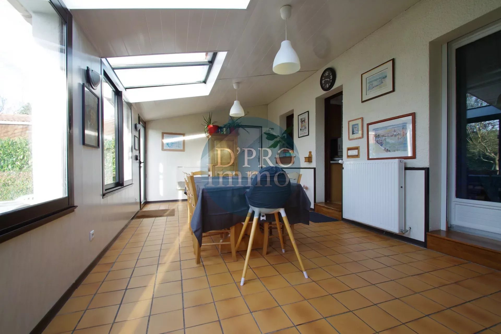 Elle se compose d'une entrée desservant un salon chaleureux avec cheminée insert, une cuisine aménagée et équipée indépendante, et une grande véranda lumineuse de 45 m², orientée plein ouest, idéale pour profiter des longues soirées d'été en famille ou entre amis.